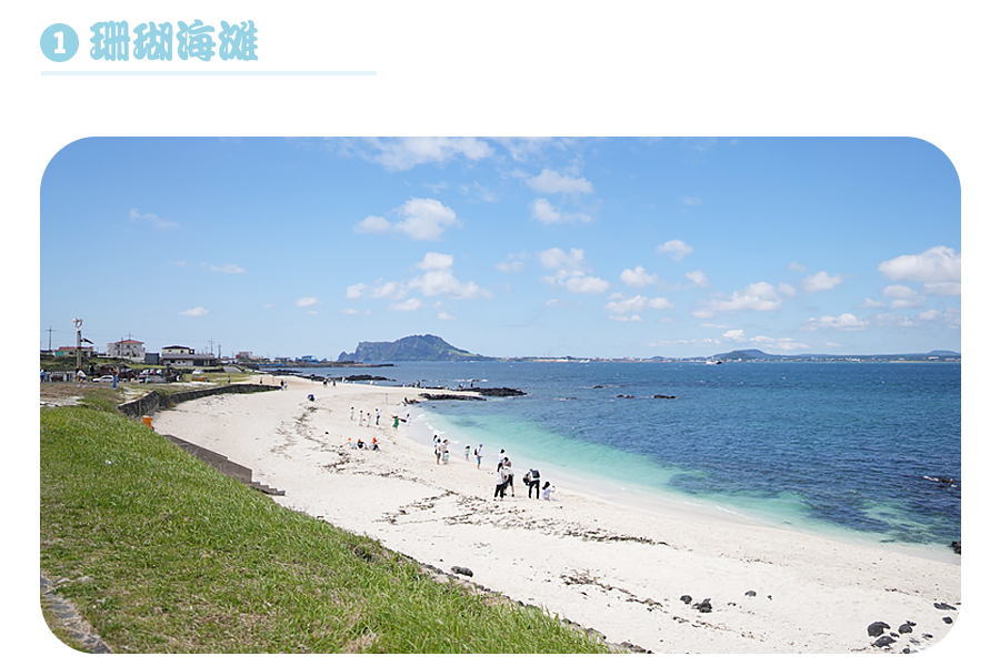 到達牛島後,有為遊客准備的觀光地循環巴士。第一站是珊瑚海灘。這裏可以一眼望見濟州島遠處的海邊。珊瑚海邊就像下著白雪一樣,在珊瑚沙的點綴下,海灘的美麗景象格外引人注目。仿佛在法國被稱為太陽之海的"Côte d'Azur"一眼就讓人聯想到的美不勝收。在珊瑚海邊光著腳,感受一下清涼的海水也會超美妙。
