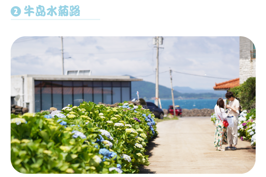 看上去就像紅地毯一樣展開著。水菊的美麗分外惹眼,如果一直沿著這條路走你會看到濟州蔚藍的大海還有寂靜的小區景象,就像小時候奶奶讀的童話故事中的村莊,給人一種走在鄉下一樣的感覺。為從水菊路走到下一站距離相當遠,推薦回到haumok洞港坐公共汽車。