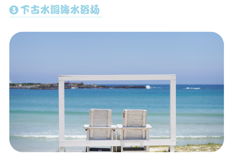 牛島觀光地循環巴士第三站是下古水洞海水浴場。河高水東海水浴場是牛島內的家人和戀人經常光顧的熱門場所。沙子柔軟、水深淺,最適合享受海水浴。還有以藍色大海為背景拍照的拍照區。其中SNS最有名的是相框裏的椅子拍照區。以眺望大海的背影和藍色濟州島背景的拍照區很受歡迎。