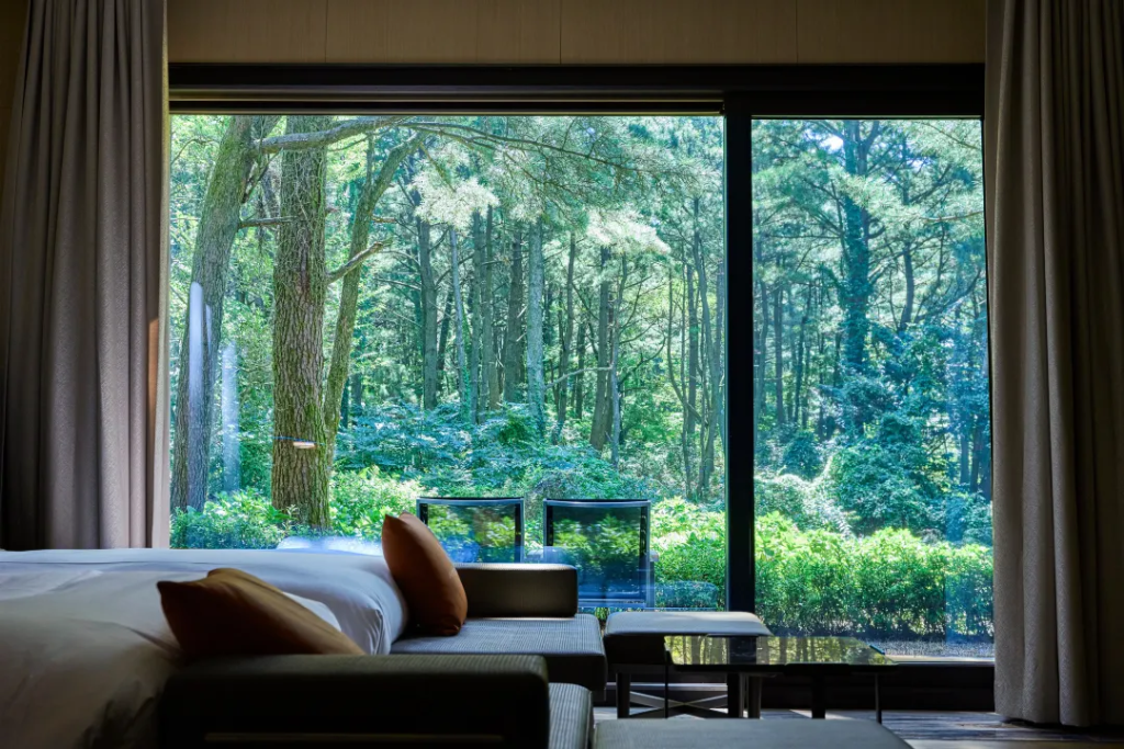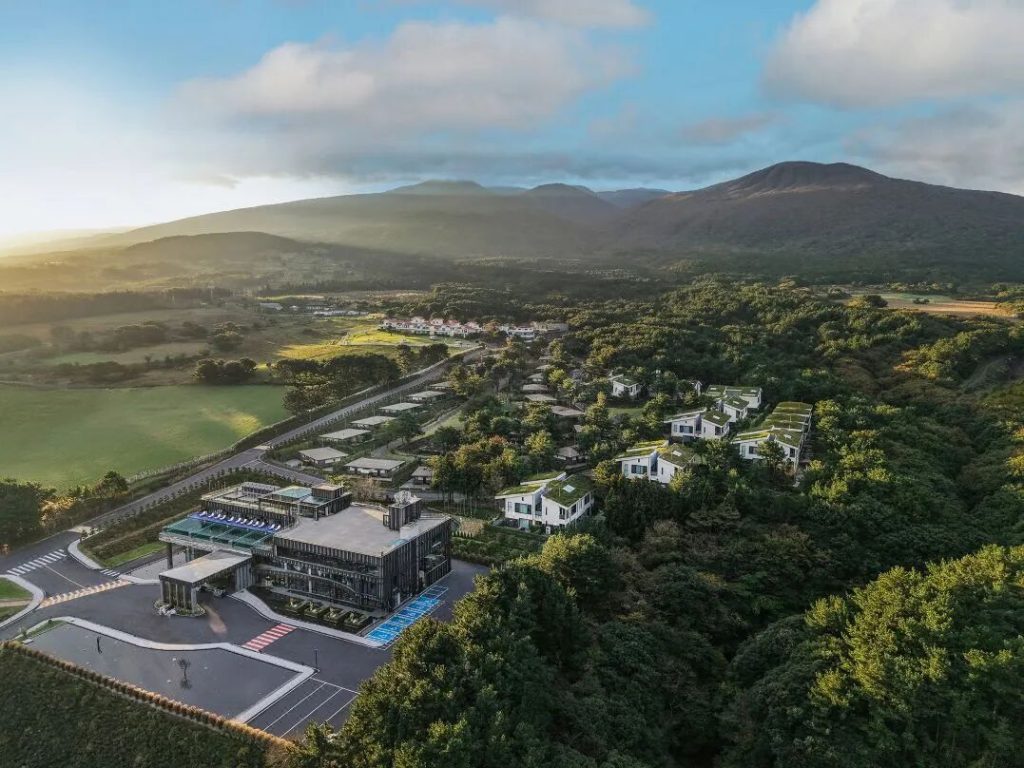度假村是22年底剛開業的,位於漢拿山山腰,主打親近自然的療愈度假體驗,分為獨棟別墅FOREST和聯排別墅HILL兩類客房,每一間客房都擁有面對森林的落地窗,還有戶外泡湯池和壁爐,旨在感受治愈與寧靜的自然氛圍。